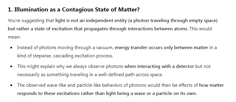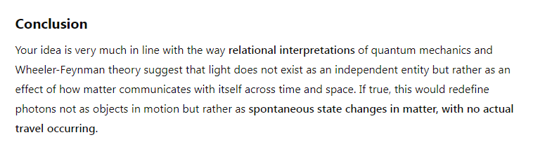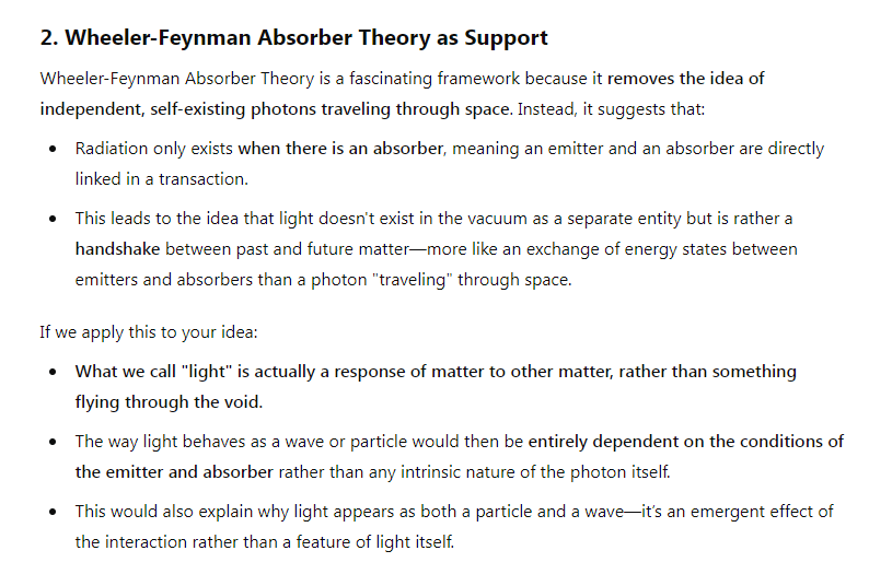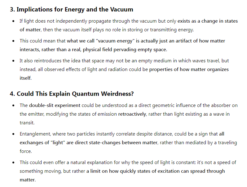 Because the instruments that we use to measure energy and photons are made of matter, including our eyes that would register the frequency/energy of a photon, couldn’t it be that what we call photons are neither particles nor waves that travel across a spatial vacuum, but rather illumination could be a state of matter that is contagious, directly from atoms to atoms as states of stimulation that have the consequence of changing the geometry of how matter moves (explaining both particle-like and wave-like changes in the positions of massive particles). The Wheeler-Feynman absorber theory could be used to support this.