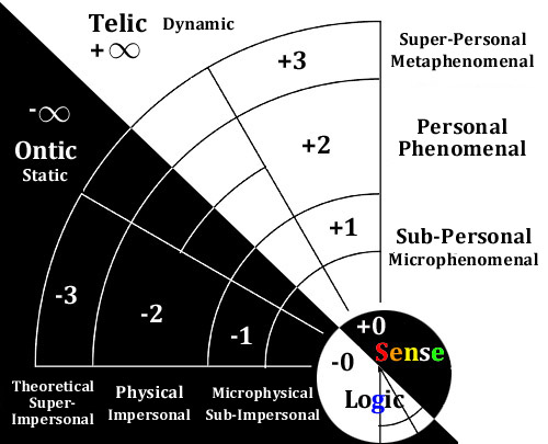 It is not incorrect to say that for these reasons the metaphenomenal can be considered metaphysical, however I think that is where we are placing the emphasis on the wrong set of properties. Instead of using experiences such as intuition, synchronicity, and even divination as scientific clues to a super-personal range of awareness, we are distracted by the apparent contradiction to physics (as if ordinary awareness did not contradict physics already). To rehabilitate our perspective, I suggest considering the relation between the different ranges of physical (ontic) and phenomenal (telic) phenomena in this way: