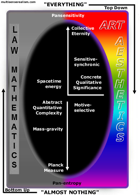 The top down and bottom up arrows show the circulation of intentional sequence and unintentional consequence throughout the continuum. From the pansensitivity pole on the top, where all substitutable gaps of sensitivity have been filled in and sense is total, to the pan-entropy pole on the bottom, where the ratio of gap to connection is almost infinitely great, a picture of cosmos emerges as a hyperplasticity of perspective.