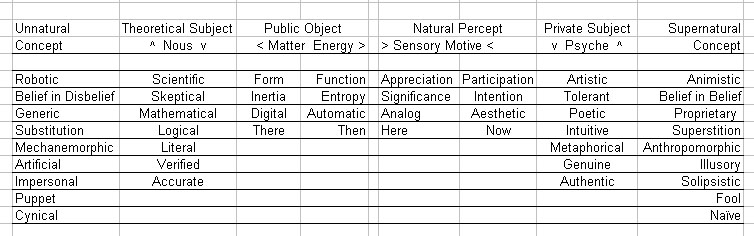I’m also liking the label of “Unnatural” to balance the opposite “Supernatural” category. The uncanny quality of artificial substitutes and robotic behavior fits in well as the extreme end of Nous or mind. The oversignification of psyche is overly proprietary and solipsistic.