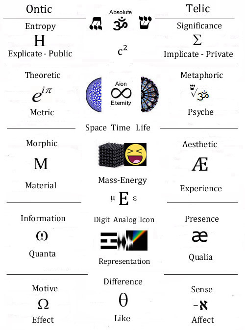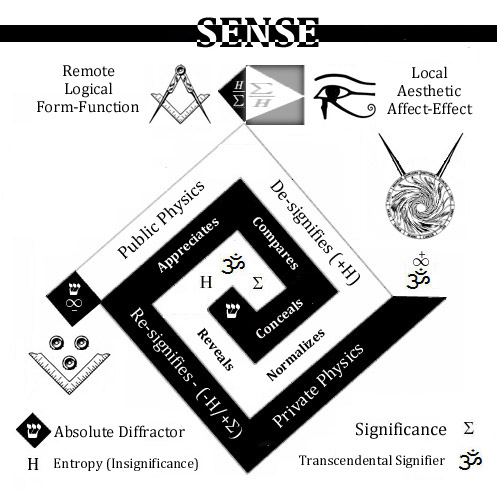This square spiral logo is coming in handy, but my apologies if it is getting monotonous. This is an informal flow chart of what might be called cosmological metabolism. The interplay between H and Σ describe the catabolic and anabolic principles (Entropy and Significance). The idea here is that the primordial identity or principle behind everything is sense, and that through the alienation or diffraction of sense, followed by re-uniting, significance is gained.