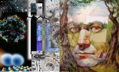 3) a highly divergent spectrum of realism. The Matroyshka dolls with reflection underneath represent this range of clear/real, vs blurred/intuitive, and reflective/fiction. By contrast, the entangled reflections of the microphysical level of physics are neither real nor fictional. With space and time fused, matter and energy become interchangeable foregrounds for information processing.
