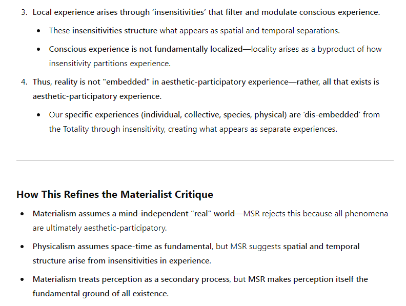The correct position of MSR is that aesthetic-participatory phenomena is the nature of existence, even superseding ‘existence’ in the sense that not only is reality an aesthetic-participatory presentation, but fantasy and fiction are as well. The difference between reality and fantasy/fiction are in the modalities and scopes of sensitivity that are used. A mirage is a perceptual fact, it’s just that in fact visibility is a different sense modality than tactile-haptic/tangibility so that they don’t always agree and one sense could have more or less relevance than another. The more sense modalities and the larger their scope, the closer the experience is to the absolute Totality, which would be true and real in an absolute/ultimate sense, however any given conscious experience is a diffracted subset of the totality (diffracted by a complex dynamism of insensitivity that filters and modifies conscious experience locally, and which localizes it in the first place. Spatial and temporal qualities of experience are derived from the insensitivities that seem to separate experience from itself, from unity to units).
