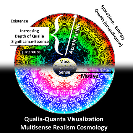 Under the Ouroboran monism proposed by MSR, dualism itself is not as important as the capacity to appreciate differences, not only for their property of being different, but for the rich aesthetic qualities which are revealed through that capacity of sense. That capacity is deemed to be Absolute, as that which can never transcended or disconnected from. While many physicists have grasped that all of physics can be reduced to relationships, MSR takes it a critical step further to say that beneath all ‘relationships’ are the capacity to participate and perceive – to relate directly to what is related…and not merely for the purpose of receiving the structural fact of relations, but to appreciate the qualities that relations exist to produce. The purpose of the universe is not merely physical, logical, and spiritual, but overwhelmingly it is aesthetic. The primordial unit of ‘pattern’ must give way to the deeper context of pansensitivity: the gourmet cuisine of pattern creation and consumption.
