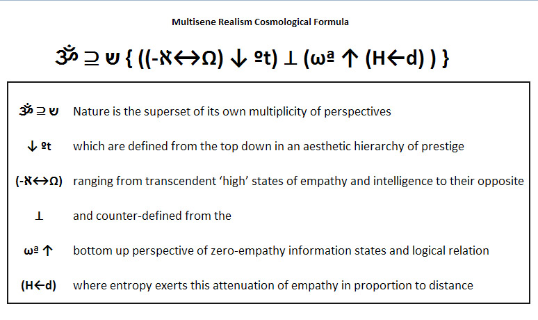 Multisense Realism  proposes that the cosmos is an involuted, reflexive, tessellated or ‘Ouroboran Monism’ – a non-neutral monism in which experienced presence defines itself by the projection of  its own pretended absence. What is proposed is a universal sense which modulates itself through various kinds of insensitivities; delays, maskings, distortions and diffractions. Such insensitivities or entropies, are, in their purest form, what we know to be space and time. To be clear, time is not clock time (which are measurements of spatial changes in public physical phenomena), but rather the sense of narrative sequence, of evolving stories which spiral or gyrate thematically rather than merely repeat.