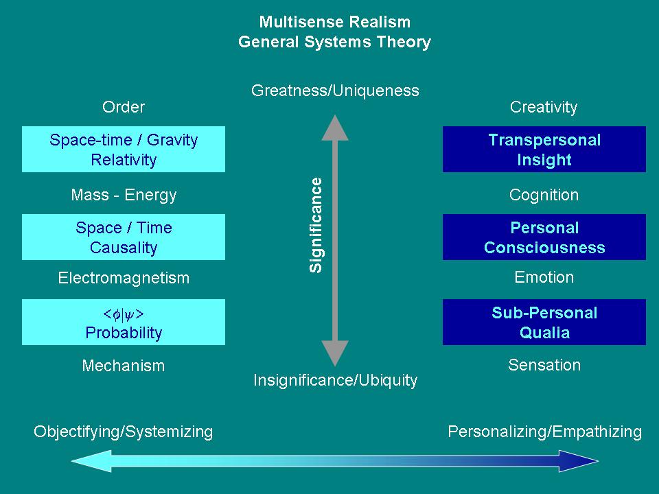 Yeats, like Locke and Galileo before him, conceived of the worldly half of the universe as “Primary”, which is perfectly natural considering that when we are awake we find ourselves surrounded by a physical world which is so much larger and more durable than ourselves. MSR proposes not that we invert this relation into solipsism, where internal phenomena are primary and the external world is secondary, but to see our own subjectivity as just one tier in a continuum which is much more vast and durable than even physics. Under MSR, both the dualistic Western and non-dualistic Eastern views both exist within the total continuum of sense.