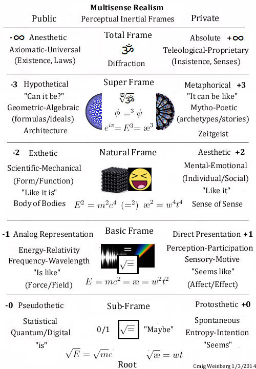 It makes more sense that existence itself is an irreducibly sensory-motive phenomenon – an aesthetic presentation with scale-dependent anesthetic appearances rather than a mass-energetic structure or information processing function. Instead of consciousness (c) arising as an unexplained addition to an unconscious, non-experienced universe (u) of matter and information (mi), material and informative appearances arise as from the spatiotemporal nesting (dt) of conscious experiences that make up the universe.